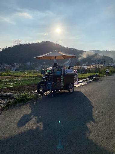 Untuk melengkapi suasana santai, banyak pedagang kopi maupun makanan ringan yang berjualan di sepanjang jalan. Mereka menggunakan kendaraan bak terbuka atau gerobak sederhana sebagai lapak. Menu yang tersedia cukup beragam, mulai dari kopi, teh hangat, hingga sate dan mi instan dengan harga yang terjangkau.